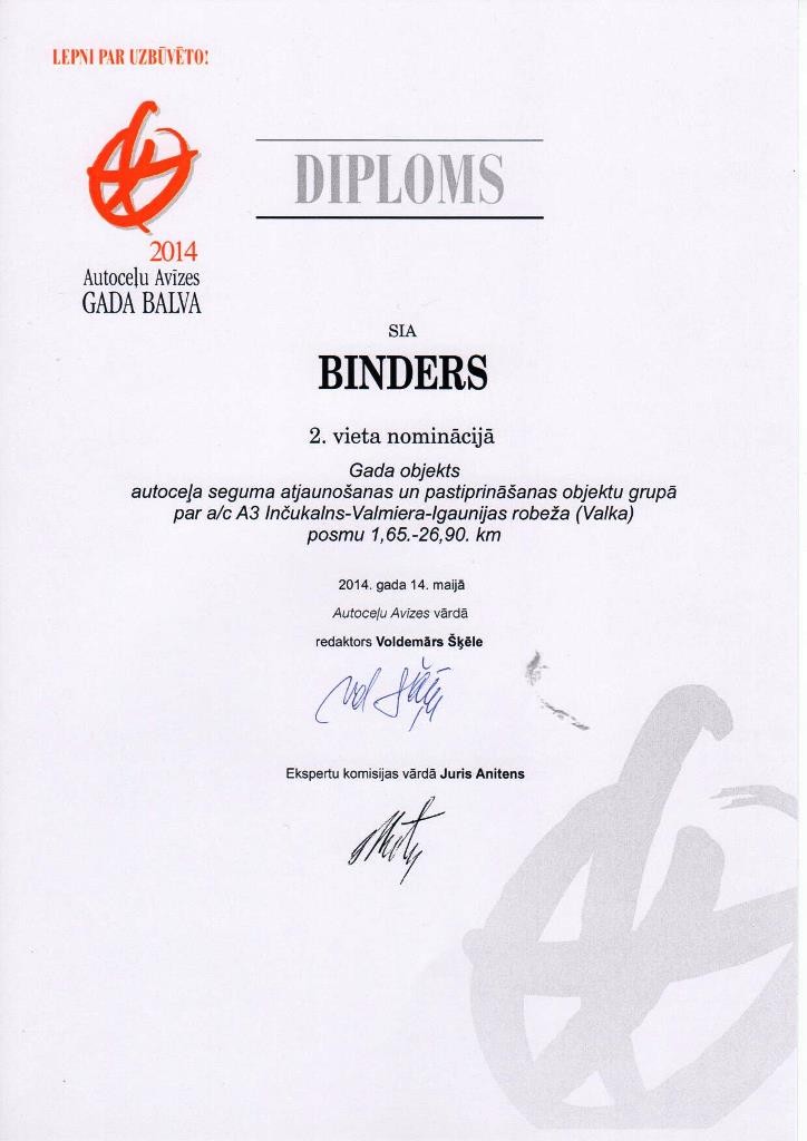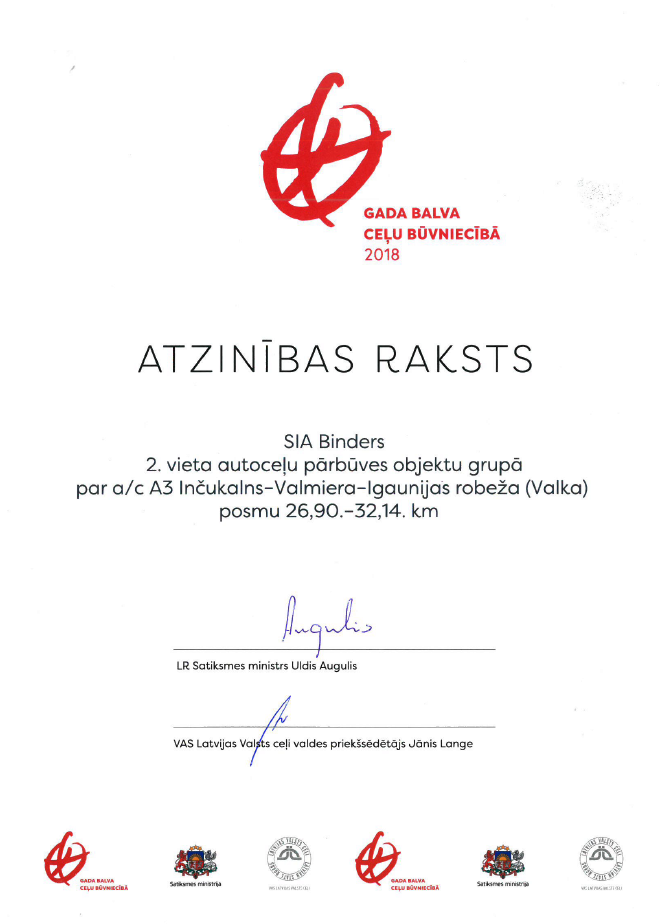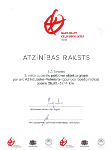 "Autoceļu Avīzes" Gada balva 2014 - 2.vieta nominācijā "G ada objekts" autoceļa seguma atjaunošanas un pastiprināšanas objektu grupā par a/c Inčukalns-Valmiera-Igaunijas robeža (Valka) posmu 1,65.-26,90. km.