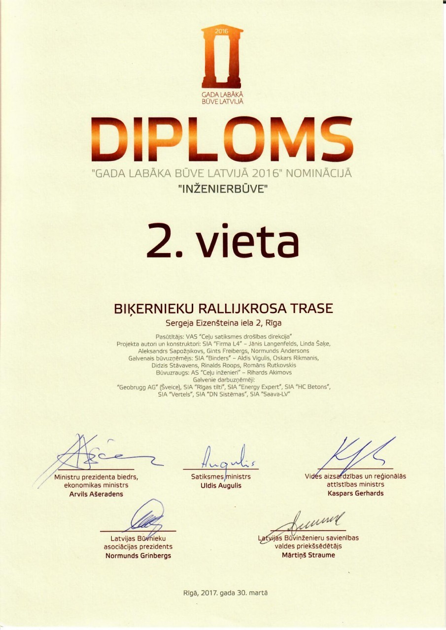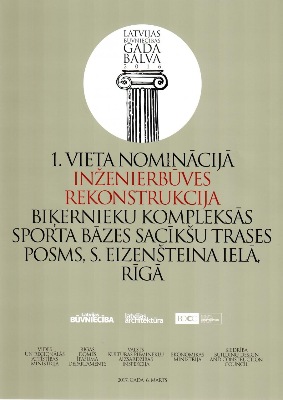 Latvijas Būvnieku asociācijas un Latvijas Būvinženieru savienības skate "Gada labākā būve Latvijā 2016" - 2.vieta nominācijā "Inženierbūve" Biķernieku kompleksās sporta bāzes sacensību trases posmam.