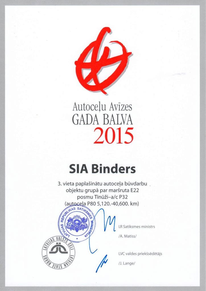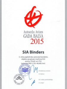 "Autoceļu Avīzes" Gada balva 2015 - 3.vieta paplašinātu autoceļa būvdarbu objektu grupā par maršrurta E22 posmu Tīnūži-a/c P32.