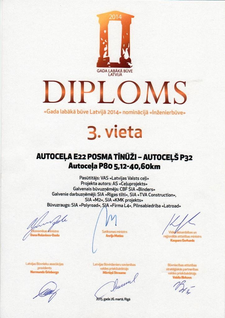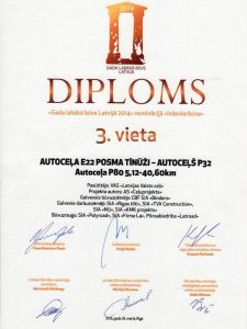 Latvijas Būvnieku asociācijas skate "Gada labākā būve Latvijā 2014" - 3.vieta nominācijā "Inženierbūves" par autoceļa E22 posma Tīnūži - autoceļš P32 būvniecību un rekonstrukciju.
