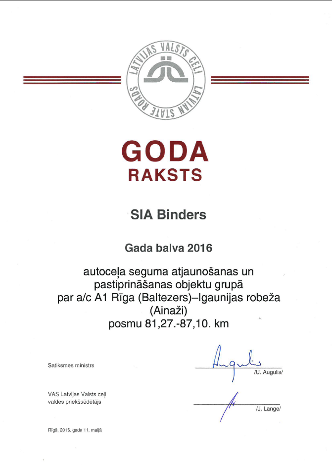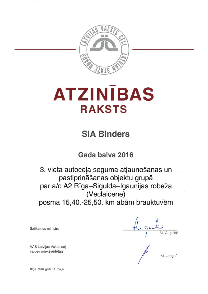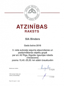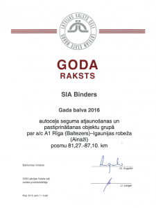 Ceļu būvniecības nozares "Gada balva 2016" - autoceļu seguma atjaunošanas un pastiprināšanas objektu grupā par a/c A1 Rīga ( Baltezers) - Igaunijas robeža ( Ainaži) posmu no 81,27. līdz 87,10. km. 3.vieta šajā grupā - par a/c A2 Rīga-Sigulda Igaunijas robeža ( Veclaicene) abām brauktuvēm posmā no 15,40.līdz 25,50.km.