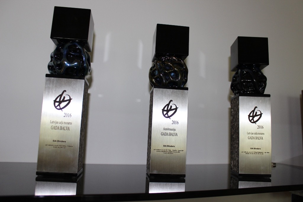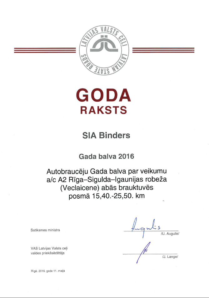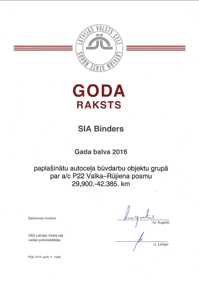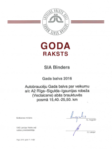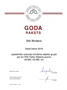 Ceļu būvniecības nozares " Gada balva 2016" - paplašinātu autoceļa būvdarbu objektu grupā par a/c P22 Valka-Rūjiena posmu no 29,900. km līdz 42,385.km. Autobraucēju "Gada balva 2016" - par veikumu a/c A2 Rīga - Sigulda - Igaunijas robeža ( Veclaicene) abās brauktuvēs posmā no 15,40. km līdz 25,50. km.