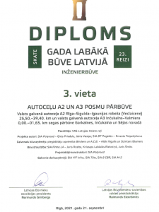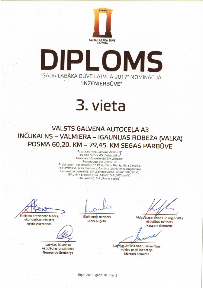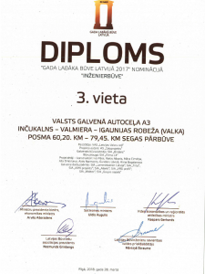Latvijas Būvnieku asociācijas un Latvijas Būvinženieru savienības skate "Gada labākā būve Latvijā 2017" - 3.vieta nominācijā "Inženierbūve" autoceļa A3 Inčukalns-Valmiera-Igaunijas robeža (Valka) seguma pārbūvei posmā no 60,20.līdz 79,45.km.