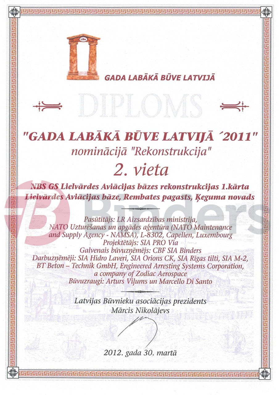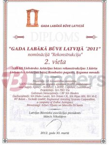 Latvijas Būvniecības asociācijas skate "Gada labākā būve Latvijā 2011" - 2. vieta nominācijā "Rekonstrukcija" par Lielvārdes lidlauka rekonstrukcijas 1. kārtu.