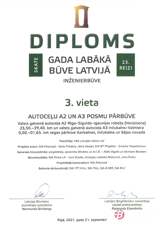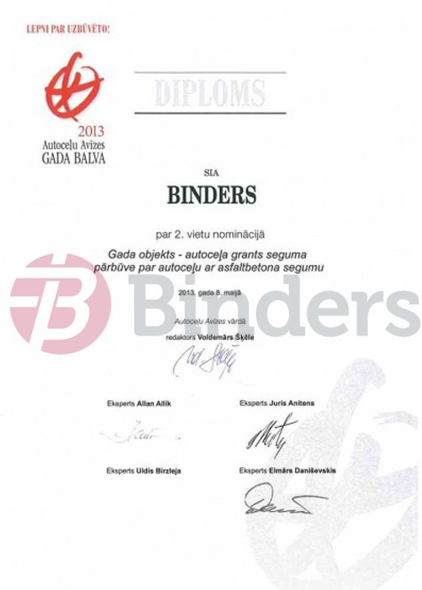 Latvijas Būvnieku asociācijas un Latvijas Būvinženieru savienības skate "Gada labākā būve Latvijā 2020" - 3. vieta nominācijā "Inženierbūve" par valsts galvenā autoceļa A2 Rīga-Sigulda-Igaunijas robeža segas pārbūvi (pastiprināšanu) posmā 25,50.-39,40. km un autoceļa A3 Inčukalns-Valmiera posmā 0,00.-01,65. km. Būvniecība: piegādātāju apvienība "Binders un ACB".
