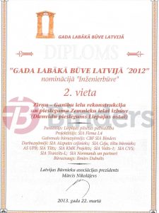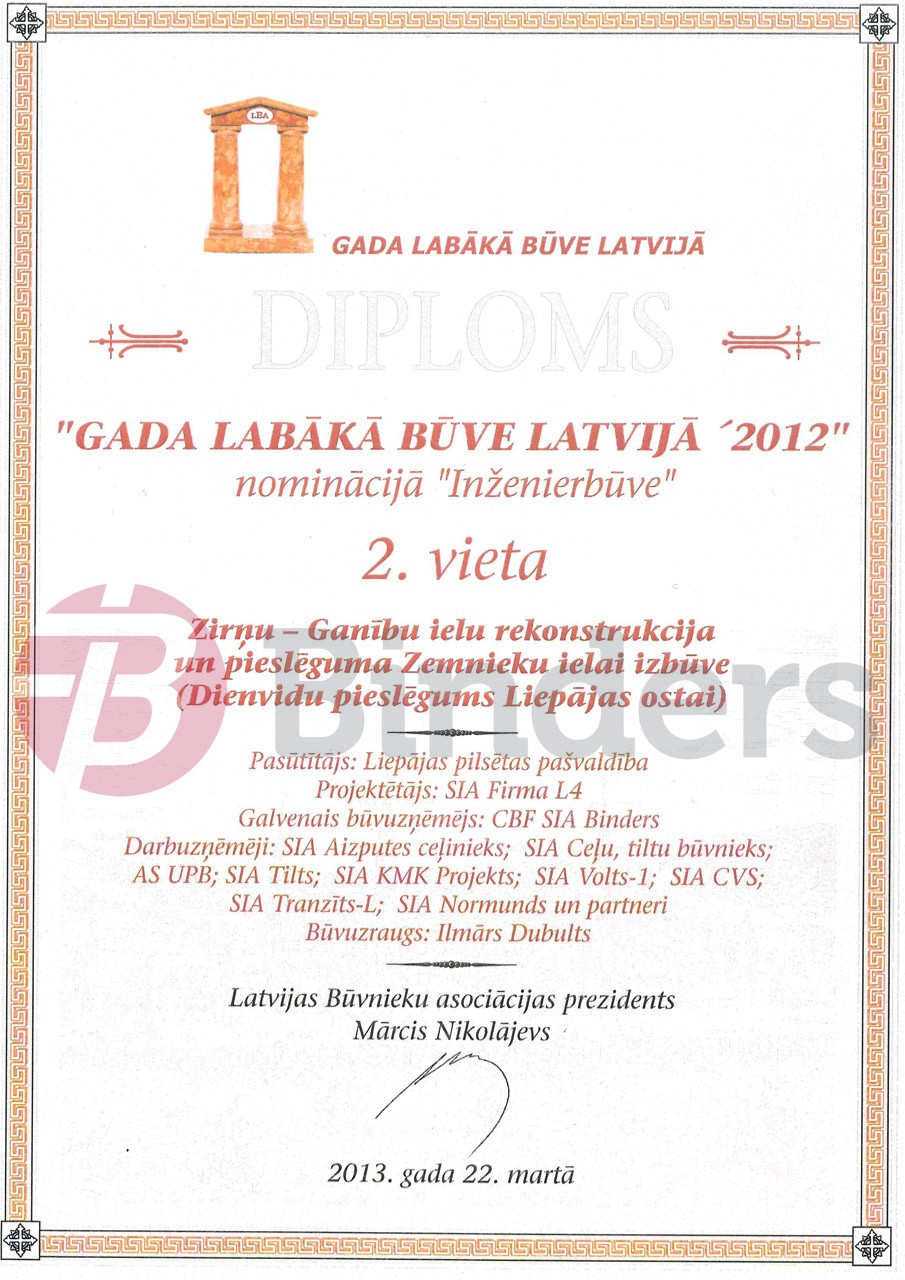 Latvijas Būvnieku asociācijas skate "Gada labākā būve Latvijā 2012" - 2.vieta nominācijā "Inženierbūve" par Zirņu-Ganību ielas rekonstrukciju un pieslēguma izbūvi Zemnieku ielai Liepājā.