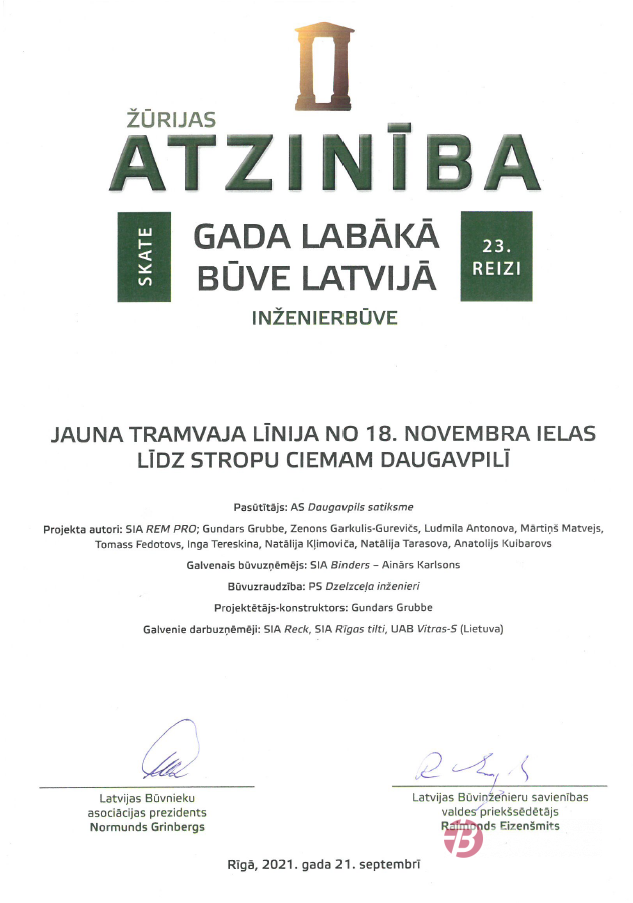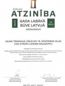 Latvijas Būvnieku asociācijas un Latvijas Būvinženieru savienības skate "Gada labākā būve Latvijā 2020" - Atzinība nominācijā "Inženierbūve" par tramvaja līnijas 18.Novembra iela-Stropi būvniecību Daugavpilī.