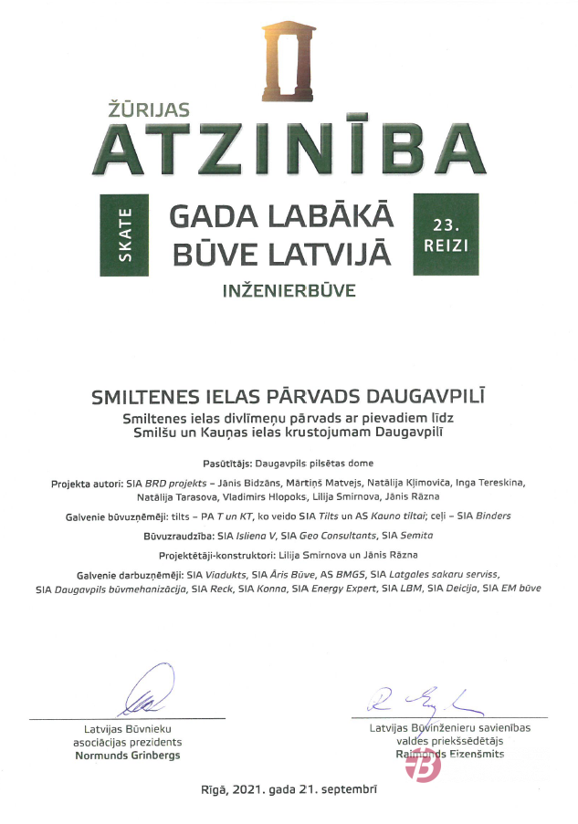 Latvijas Būvnieku asociācijas un Latvijas Būvinženieru savienības skate "Gada labākā būve Latvijā 2020" - Atzinība nominācijā "Inženierbūve" par Smiltenes ielas divlīmeņu pārvada un pievadu būvniecību līdz Smilšu un Kauņas ielas krustojumam Daugavpilī – 1. kārta. Pārvada būvniecība: piegādātāju apvienība "T un KT", kurā ietilpst SIA "Tilts" un AS "Kauno Tiltai" (Lietuva). CBF SIA "Binders" - pievadi un piegulošā teritorija, asfaltēšana.