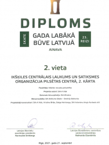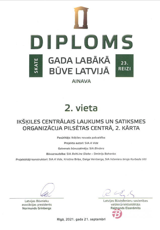 Latvijas Būvnieku asociācijas un Latvijas Būvinženieru savienības skate "Gada labākā būve Latvijā 2020" - 2. vieta nominācijā "Ainava" par Ikšķiles centrālā laukuma un satiksmes organizācijas būvniecību pilsētas centrā (2.kārta).