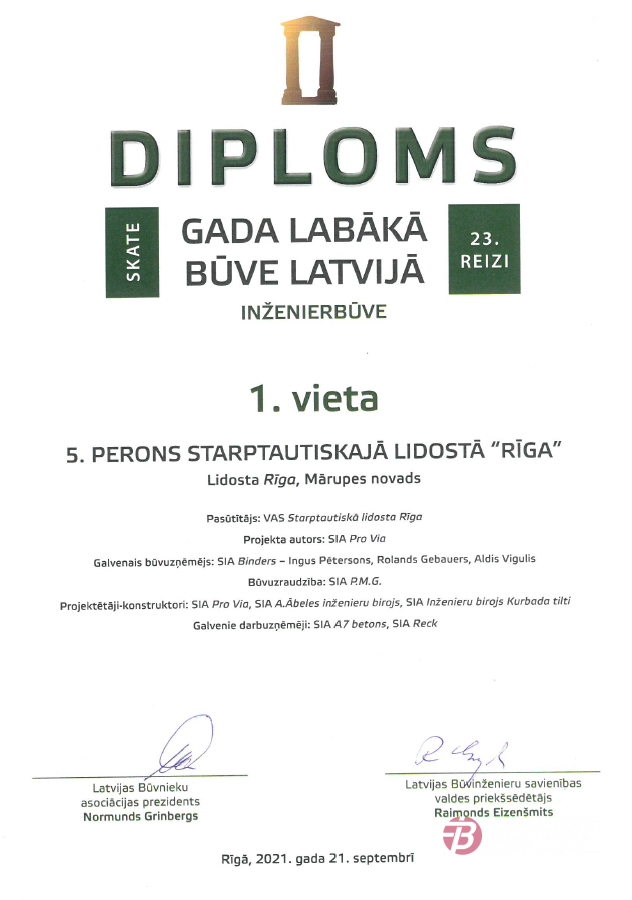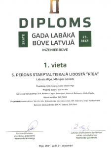 Latvijas Būvnieku asociācijas un Latvijas Būvinženieru savienības skate "Gada labākā būve Latvijā 2020" - 1. vieta nominācijā "Inženierbūve" par kravas lidmašīnu perona (5.perona) būvniecību starptautiskajā lidostā "Rīga".