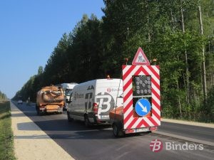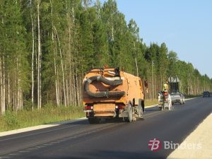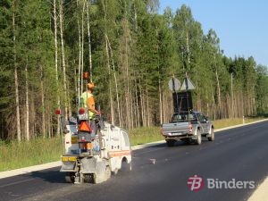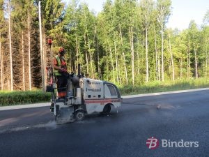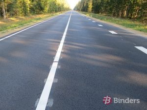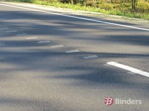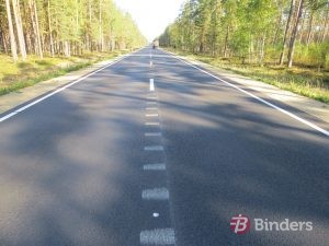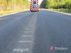 The company “Binders” has experience in constructing rigid lanes or acoustic strips in several stages on the Tīnūži-Koknese motorway. Altogether, in 24 km long axial line, a few cm deep mills (cuts) of certain sizes were created that formed the rigid lane. After milling, the axial line was coated with a thermoplastic horizontal marking.