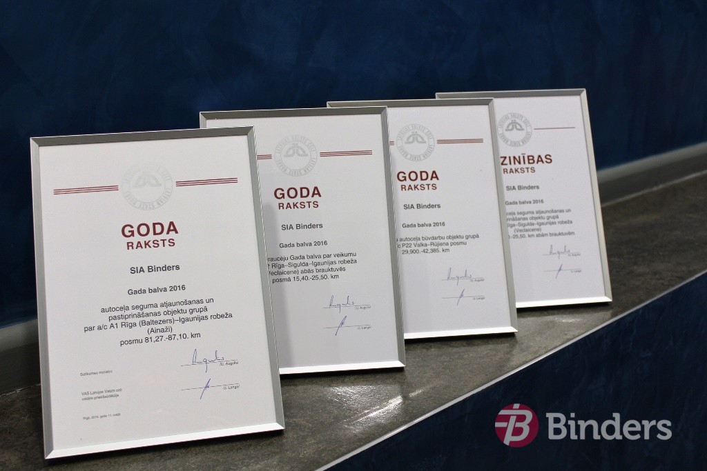25. Pastāvēšanas laikā uzņēmuma darbs vairākkārt novērtēts ar nozares profesionālajiem apbalvojumiem. “Binders” īstenotie projekti regulāri izpelnījušies gan atzinību, gan augstākos novērtējumus Latvijas Būvnieku asociācijas un Latvijas Būvinženieru savienības skatē “Gada labākā būve Latvijā” un konkursā “Latvijas Būvniecības gada balva”. Par īstenotajiem projektiem uzņēmums saņēmis arī VAS “Latvijas Valsts ceļi” Gada balvas.