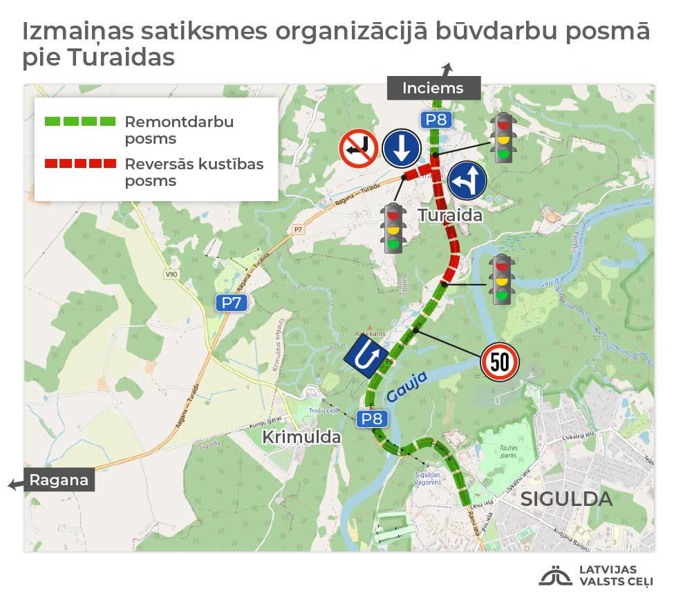 Darbi autoceļa Inciems–Sigulda–Ķegums (P8) posmā starp Turaidu un Siguldu sākās 2021. gada maijā, īstenojot projektu, tiek veikta pilna ceļa segas pārbūve. Apgaismotas ietves uzbūvēs Turaidas nogāzē līdz esošajai gājēju takai pie Gūtmaņa alas, kā arī Siguldas nogāzē līdz Gaujas tiltam. Lai nodrošinātu kontrolētu ūdens atvadi no ceļa konstrukcijas un mazinātu nogāžu eroziju, tiek izbūvēta drenāžas un lietus ūdens kanalizācijas sistēma.