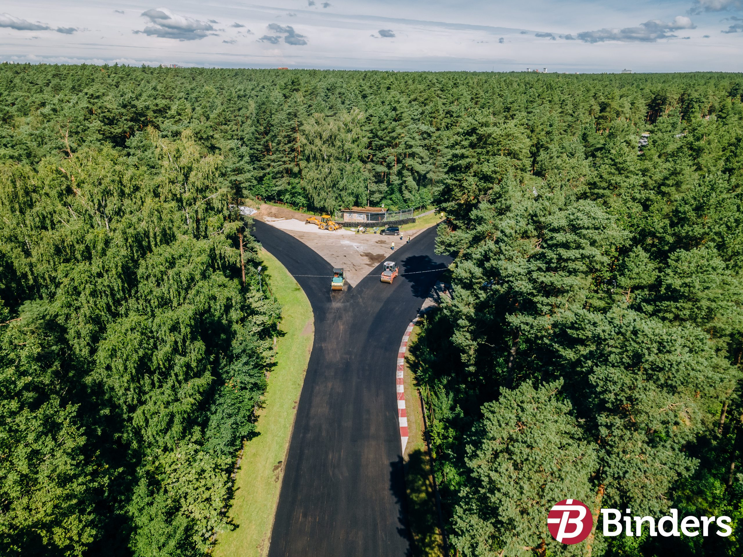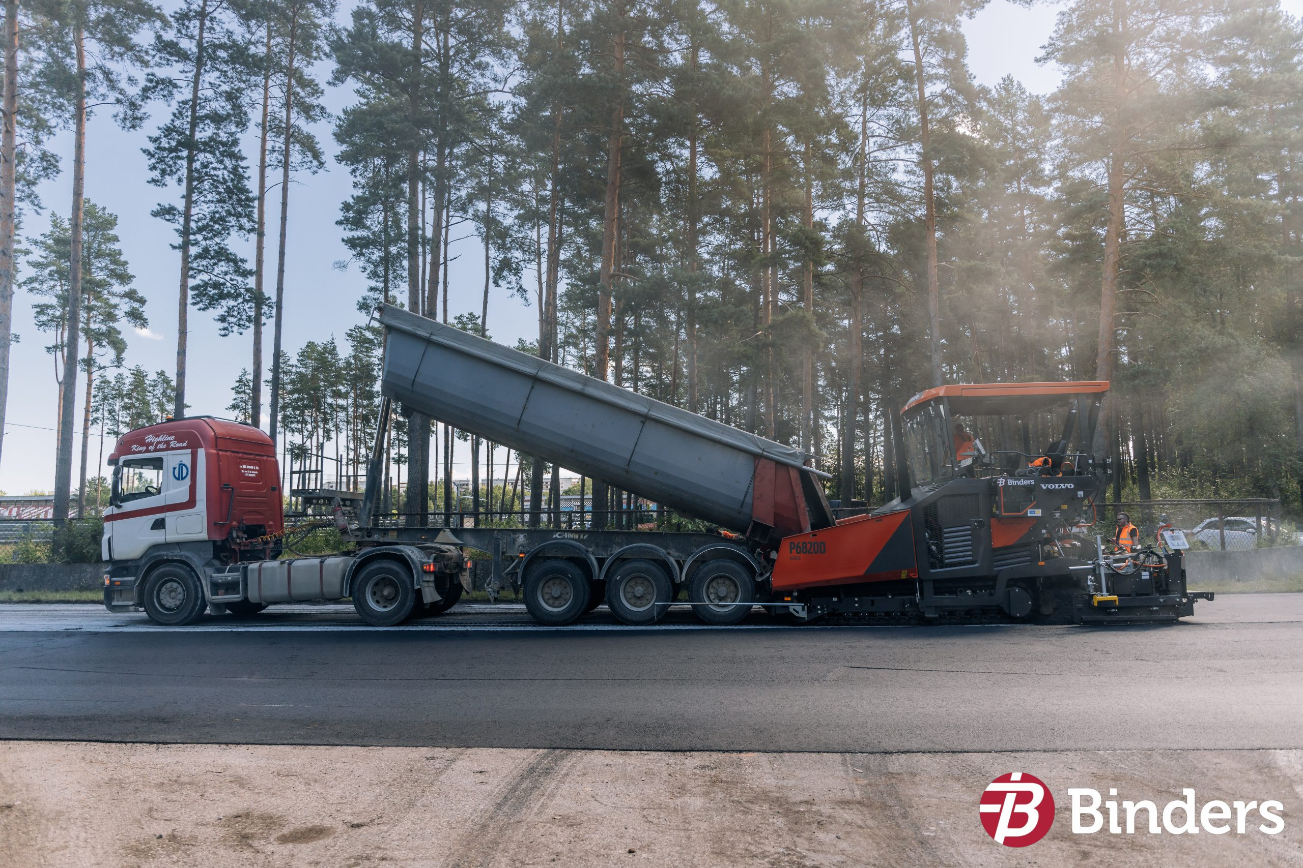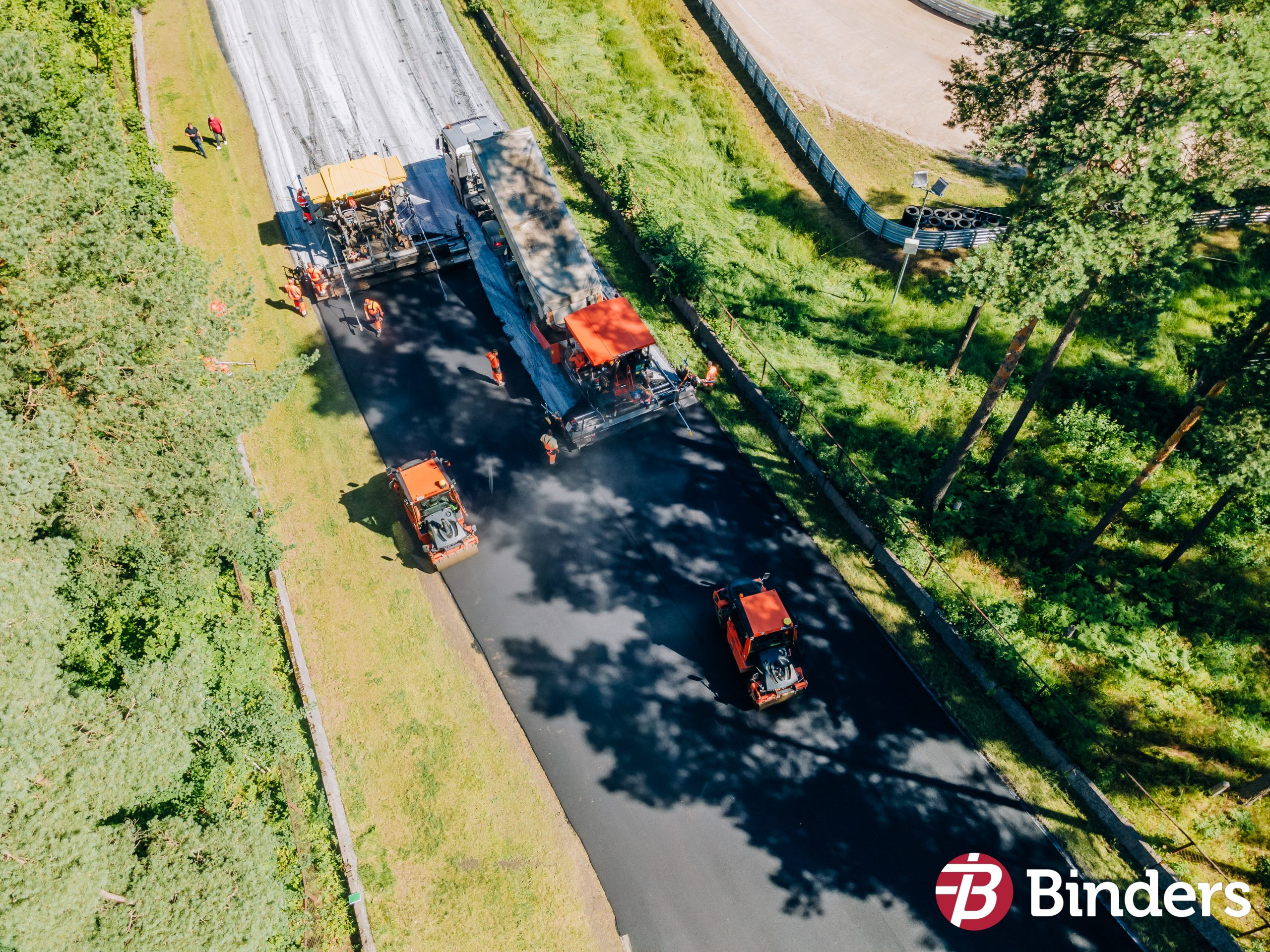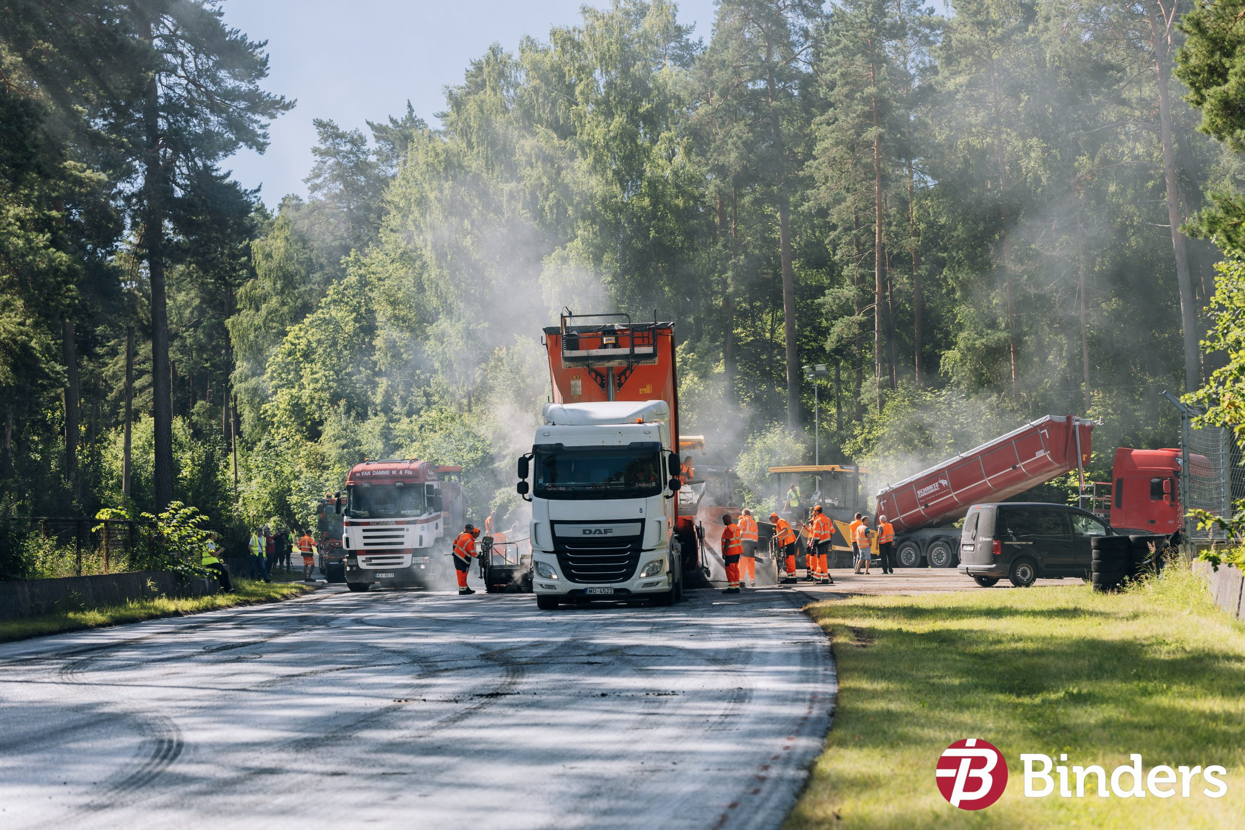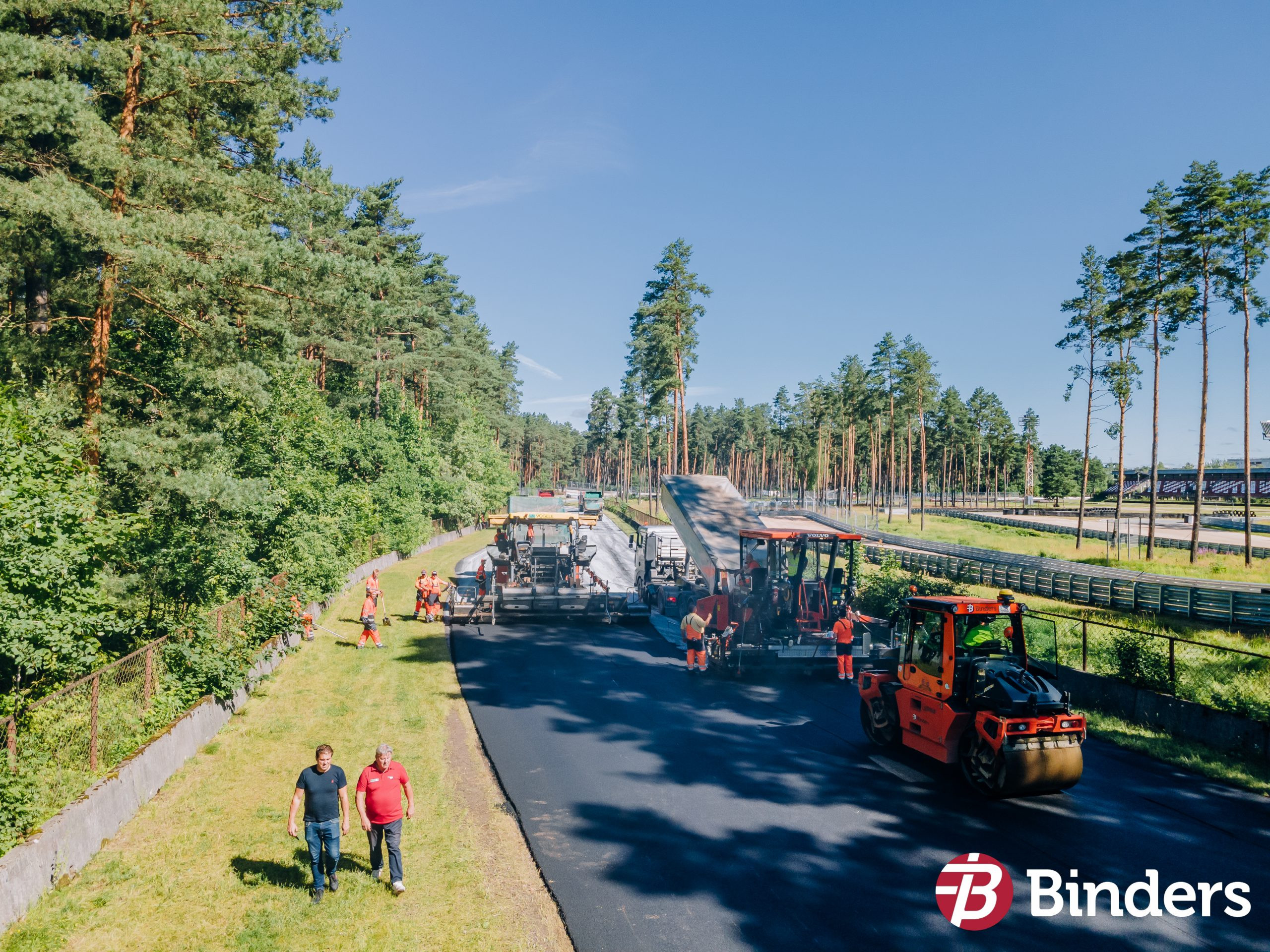 Trases atjaunošanai paredzētajās zonās jūlijā ieklāts jauns asfaltbetona segums kopumā 10 tk m2  apjomā.   Atbilstoši sacīkšu trases specifiskajām prasībām, segumam jābūt bez šuvēm, tādējādi jaunā virsma tika ieklāta vienlaicīgi ar četriem asfalta ieklājējiem. Trasē ieklātais asfalts saražots  un testēts ‘Binders” asfaltbetona ražotnē  un ceļu būvmateriālu testēšanas laboratorijā  Vangažos.