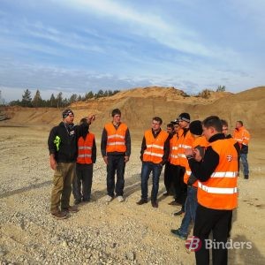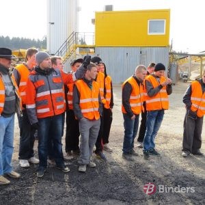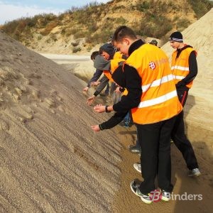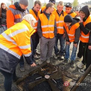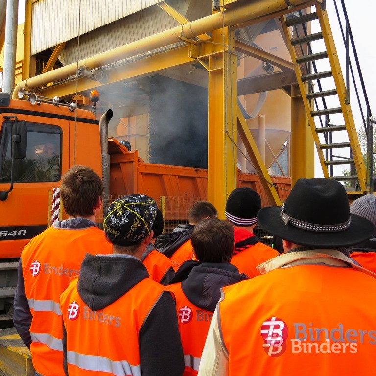 „Binders” asfalta ražotnē jaunieši guva praktisku ieskatu ražošanas procesā, sākot no asfalta sastāvdaļu komplektācijas un beidzot ar brīdi, kad ražotnes bunkuri atveras un gatavā masa tiek pildīta transportā, lai tiktu nogādāta objektā.