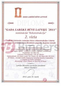 Savukārt kategorijā “Rekonstrukcija” 2.vietu ieguva Nacionālo bruņoto Gaisa spēku Lielvārdes aviācijas bāzes rekonstrukcijas pirmā kārta. Projektētājs – SIA “Pro Via”, galvenais būvuzņēmējs SIA “Binders”.
