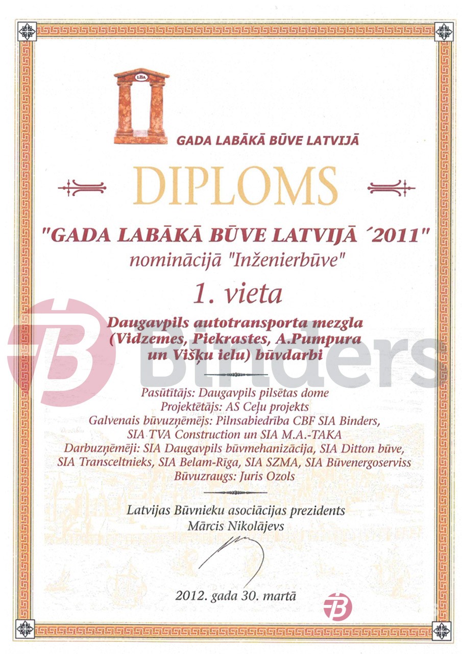 Latvijas Būvnieku asociācijas skatē “Gada labākā būve Latvijā 2011” kategorijā “Inženierbūve”  galveno balvu ieguva Daugavpils autotransporta mezgla ( Vidzemes, Piekrastes, A.Pumpura un Višķu ielu) būvdarbi. projektētājs – AS “Ceļu projekts” , galvenais būvuzņēmējs pilnsabiedrība “SIA “Binders”, SIA “TVA Construction” un SIA “M.A.-TAKA”.