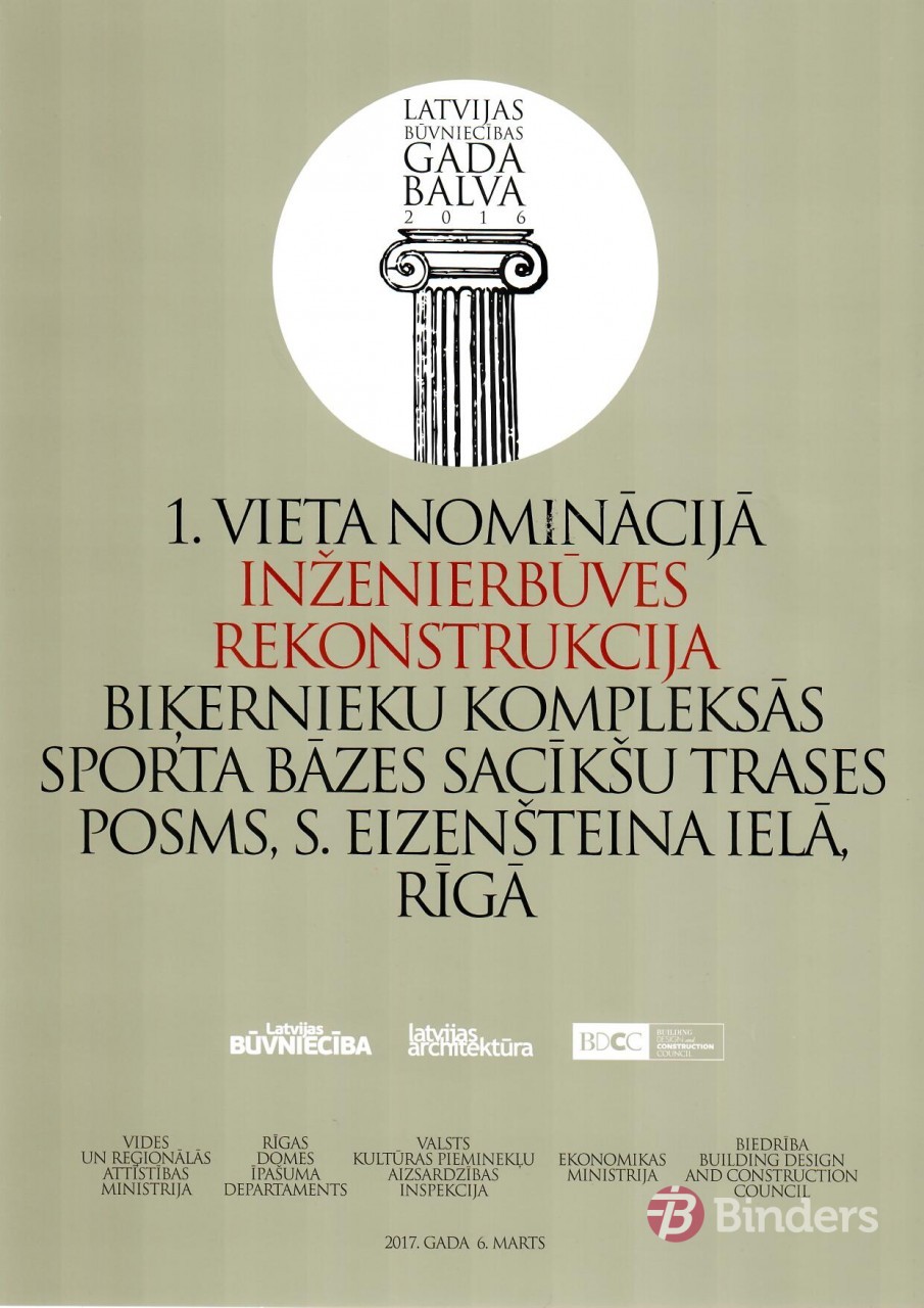 Nominācijā “Inženierbūves rekonstrukcija” konkursa žūrija 1.vietu piešķīra Biķernieku kompleksās sporta bāzes sacīkšu trases posmam, ko pagājušā gada sezonā izbūvēja ceļu būves firma SIA “Binders”.