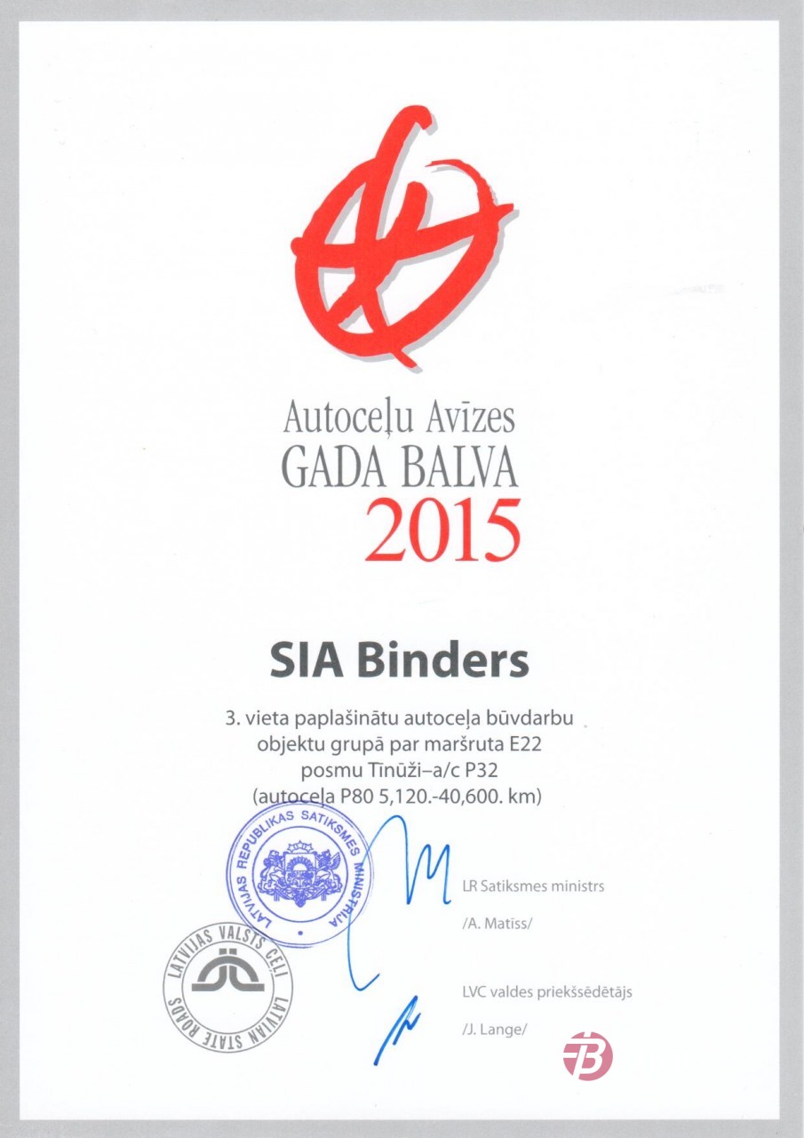 Šogad „Autoceļu Avīzes” Gada balvu paplašināto būvdarbu kategorijā ieguva  kompānijai „Binders” piederošais uzņēmums „Limbažu ceļi”, kas būvēja ceļa posmu Rūjiena-Mazsalaca. 3.vietu šajā kategorijā ieguva uzņēmums  „Binders”  par maršruta E22 posmu  Tīnūži – a/c P32.