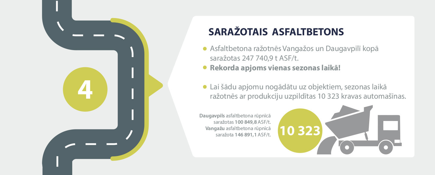 Būvdarbu sezonai 2021. gadā bija raksturīgs liels darba apjoms asfalta ražotājiem un ieklājējiem, jo lielāko daļu no kopējā būvdarbu apjoma uz ceļiem veidoja asfaltēto segumu maiņa. Līdz ar to šajā būvdarbu sezonā daudz darba bija asfaltbetona ražotnēm, asfalta ieklāšanas brigādēm un citām struktūrvienībām, kas nodrošināja procesu, sākot ar ražošanas izejvielu sagādi, beidzot ar rezultāta kvalitātes kontroli. Tas atspoguļojas arī apkopotajos datos par 2021. gada darba rezultātiem.