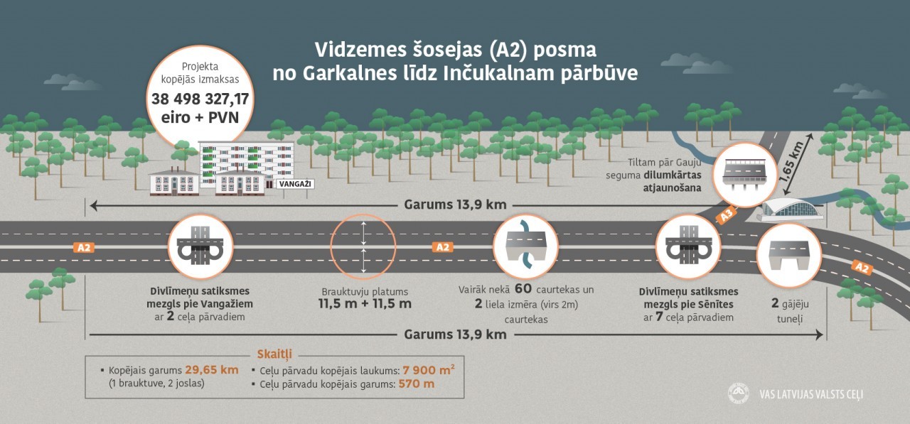 08.04.2019Piegādātāju apvienība “ Binders un ACB” aprīlī sākusi būvdarbus uz Vidzemes šosejas jeb uz valsts galvenā autoceļa A2 Rīga-Sigulda-Igaunijas robeža. Uzsākts šosejas abu brauktuvju segas pārbūves (pastiprināšanas) process posmā no 25,50. līdz 39,40. km jeb no Garkalnes dzelzceļa pārvada līdz t.s. Sēnītes mezglam, pilnībā ietverot to, un vēl apmēram 1 km Siguldas virzienā. No Sēnītes mezgla turpinājumā uz Murjāņiem segas pārbūve pusotra km garumā tiks veikta arī Valmieras šosejai jeb a/c A3 Inčukalns – Valmiera posmā no 0,00. līdz 01,65.km.