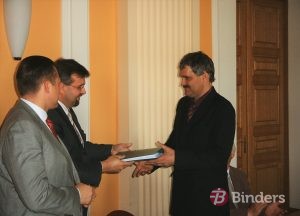 Satiksmes ministrs Ainārs Šlesers un ministrijas valsts sekretārs Vigo Legzdiņš pasniedz vairāku desmitu miljonu vērto līgumu SIA “Binders” valdes priekšsēdētājam Alvim Tanbergam.