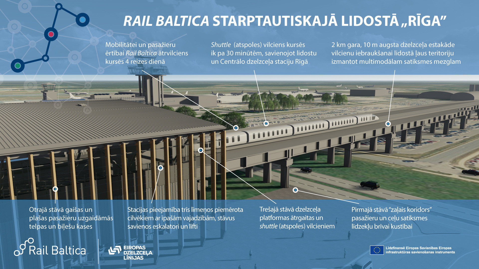 Vispirms tiks būvēta stacijas ēka trijos līmeņos, estakādes būvkonstrukcijas un piebraucamie ceļi ar saistīto infrastruktūru. Jaunās stacijas ēkas pirmajā jeb zemes līmenī tiks izveidota ērta pieejamība stacijas un lidostas kompleksam: jauni piekļuves ceļi, auto un velo stāvvietas, kāpnes, eskalatori un lifti, lai nokļūtu citos stacijas stāvos. „Zaļais koridors” pasažieriem – platība brīvai pasažieru kustībai gan no lidostas termināļa, gan uz to, kuri lidostā ieradīsies ar automašīnu, sabiedrisko transportu, velosipēdu, kā arī atlidojošiem pasažieriem. Stacijas 2. stāvā – ērtas, plašas un gaišas pasažieru uzgaidāmās telpas, biļešu tirdzniecības automāti un kases, informācijas stendi, bet 3. stāvā būs ātrvilciena un ekspreša (shuttle) no Rīgas centra pietura. Lai būtu ērtāk nokļūt nepieciešamajā stāvā no pasažieru platformām, pieejami vairāki eskalatori un lifti, pa kuriem nokļūt stacijas ēkas divos zemākajos stāvos, lai izmantotu uzgaidāmās zāles vai arī lai dotos uz lidostas termināli. Stacijas apkārtnē – jauni piekļuves ceļi auto un velo kustībai, izveidota auto stāvvieta, velo novietnes, elektroauto uzlādes vietas.