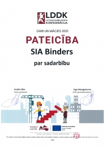 2.maijā “Binders” saņēma Latvijas Darba devēju konfederācijas pateicību par sadarbību un ieinetresētību prakses un darba vietu radīšanā jauniešiem.