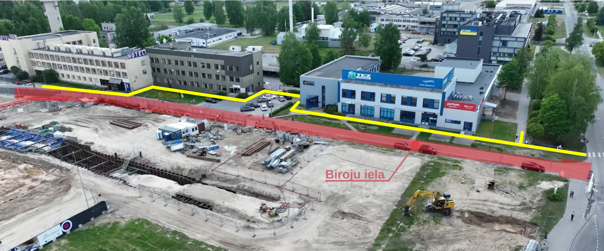 Ceļa pārbūves dēļ no 5. jūnija ir slēgts neliels Biroju ielas posms pie lidostas “Rīga”. Attēlā ar sarkanu iekrāsotajā posmā automašīnu satiksme būs slēgta, bet gājēji varēs droši pārvietoties pa īpaši izveidotu gājēju ceļu ( attēlā dzeltenā līnija). “Rail Baltica” ietvaros veiktie remontdarbi šajā teritorijā turpināsies apmēram trīs mēnešus.