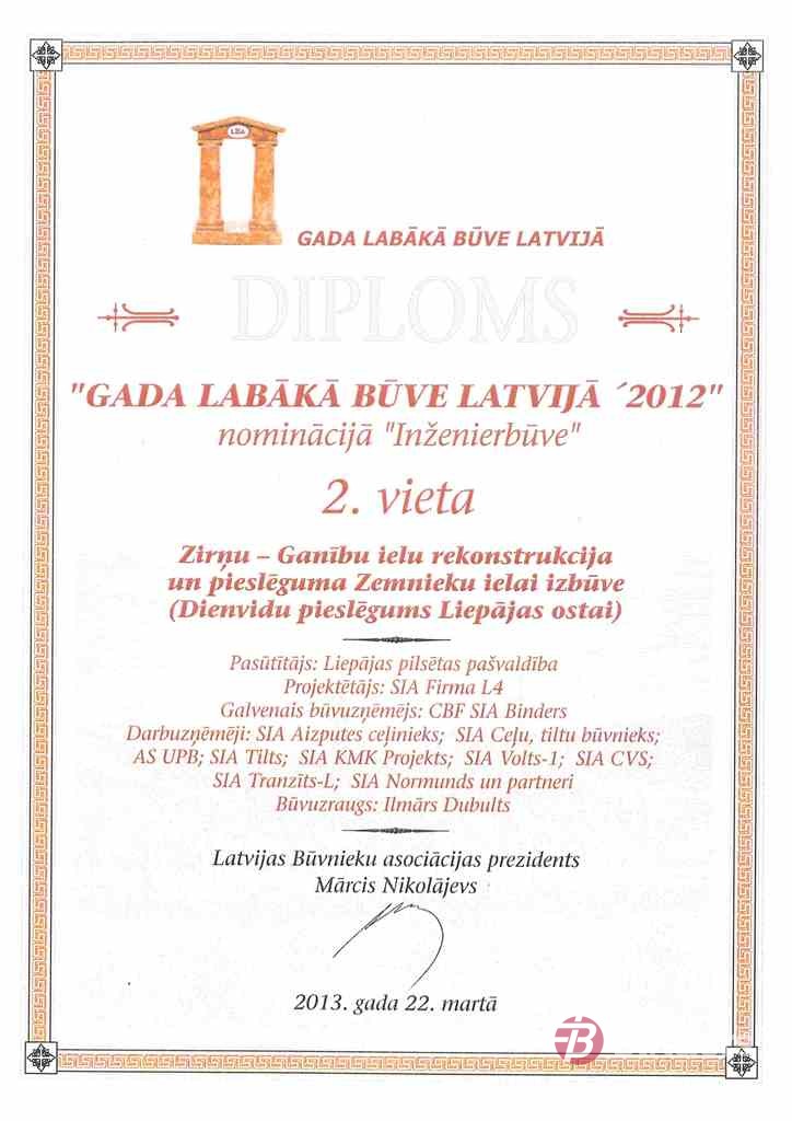22.martā paziņoti Latvijas Būvnieku asociācijas skates “Gada labākā būve Latvijā 2012” rezultāti. Skates nominācijā “Inženierbūve” 2.vietu ieguvis objekts, ko pērn ekspluatācijā nodeva “Binders”- rekonstruētā Zirņu-Ganību iela un pieslēguma izbūve Zemnieku ielai Liepājā.