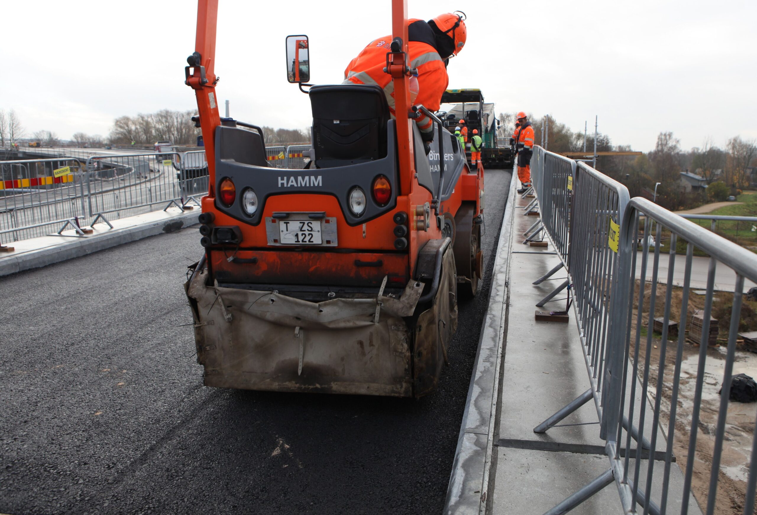 Uzsākta Sarkandaugavas satiksmes pārvada posmu asfaltēšana