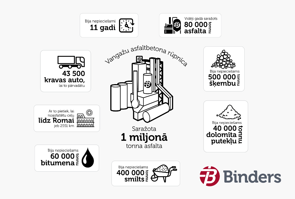Jūlija sākumā ceļu būves firmas SIA “Binders” Vangažu asfaltbetona rūpnīcā (ABR)   saražota miljonā tonna asfalta. Apjoms sasniegts 11 gadu laikā, kopš darbu sāka fundamentāli atjaunotā ražotne, ko 2007.gadā uzslēja vecās rūpnīcas vietā.