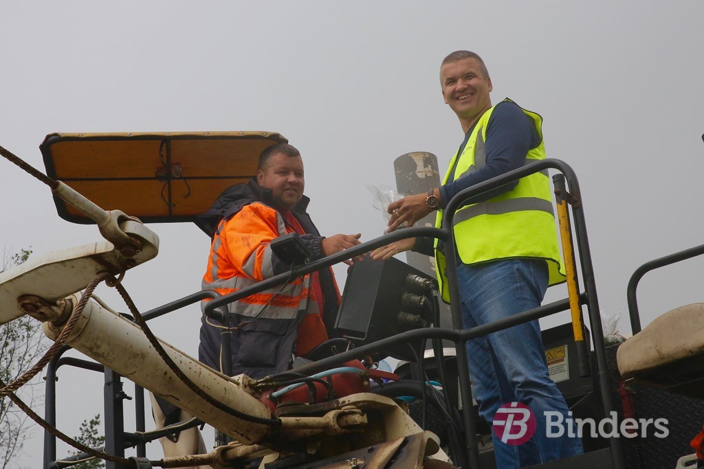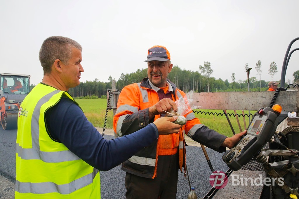 Saldu sveicienu no ražotnes saņēma arī uz ceļa strādājošie kolēģi. Tos objektā nogādāja uzņēmuma “Binders” Asfaltēšanas daļas vadītājs Gatis Skurba. Garšīgs miljonās tonnas cepiena gabaliņš tika katram vīram!